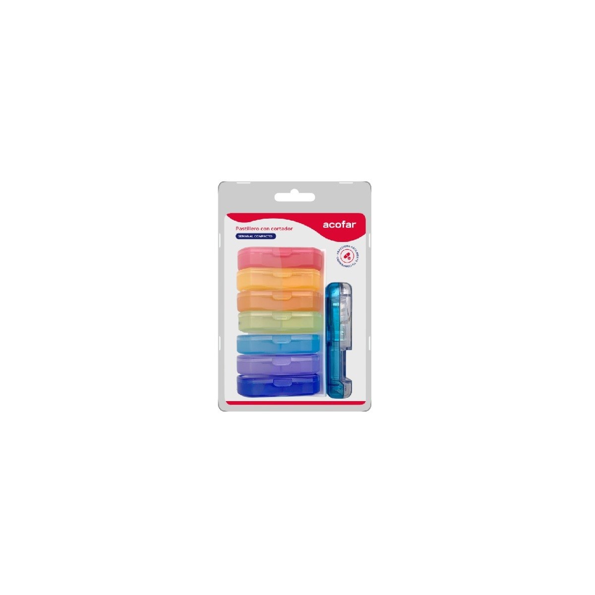 Cada módulo es un día de la semana y se diferencia por los distintos colores. Cada uno de los módulos dispone de cuatro compartimientos para repartir los diferentes medicamentos en función de la hora de la toma.Incluye un cortador de comprimidos.El cortador está compuesto de una cavidad donde se coloca el comprimido, y una pequeña cuchilla que lo corta de forma limpia y eficaz. Además, cuenta con un hueco para guardarlos.