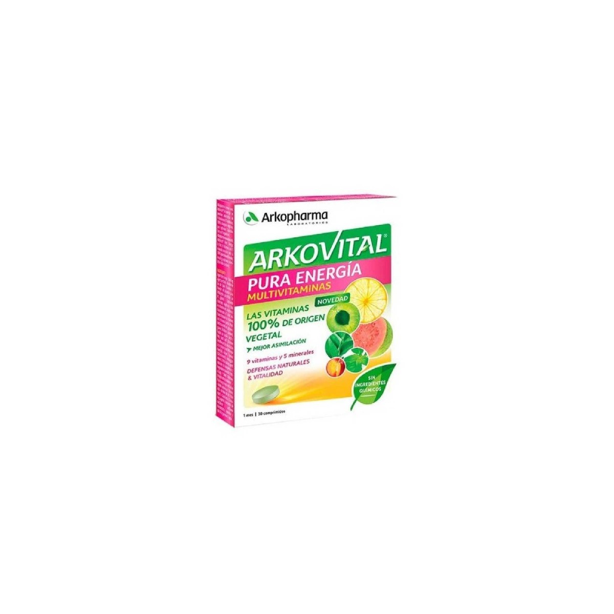 Agente de carga: sorbitol (de origen vegetal / procedente de cereales) - Zumo en polvo de baya de acerola (Malpighia punicifolia L. o Malpighia glabra L.) 248 mg/comp - Concentrado de extractos vegetales 220 mg/comp con cuantificación de vitaminas y minerales [fruto de amla (Phyllanthus emblica L.), guayaba (Psidium guajava L.), hoja de basilisco sagrado (Ocimum tenuiflorum L.), hoja de árbol de curry (Murraya koenigii (L.) Spreng.), limón (Citrus limón (L.) Burm.f.)] - Antiaglomerante: estearato de magnesio (de origen vegetal/procedente de aceites vegetales). Cubierta del comprimido: Hidroxipropilmetilcelulosa (de origen vegetal/procedente de pulpa de madera)- Ácido esteárico (de origen vegetal/ procedente de aceites vegetales)- Almidón de arroz - Colorantes de origen vegetal: concentrado de cártamo, espirulina, manzana.