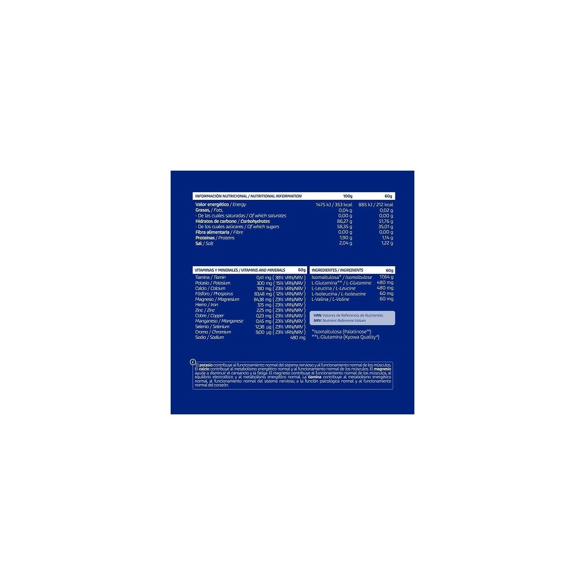 Isomaltulosa (Palatinose™)*, Maltodextrina, Fructosa, Ciclodextrina, Citrato de sodio, Fosfato de calcio, Carbonato de magnesio, Sulfato ferroso, Sulfato de zinc, Gluconato de manganeso, Sulfato cúprico, Cloruro de cromo (III), Seleniato de sodio, Acidulante (Ácido Cítrico), Citrato de potasio, Aromas, Antiaglomerante (Dióxido de silicio), L-Lecuina, L-Glutamina (Kyowa Quality®), Colorante (Beta-caroteno), L-Isolecuina, L-Valina y Vitamina B1 (Clorhidrato de Tiamina). *La Isomaltulosa es una fuente de glucosa y fructosa.